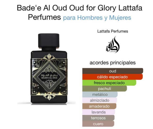 Badee Al Oud For Glory es una fragancia excepcional que irradia opulencia, elegancia y autenticidad en cada uno de sus 100 ml. Creada por la prestigiosa casa de fragancias Lattafa, esta esencia es un homenaje a la riqueza de las tradiciones orientales, con un enfoque en el lujo y la grandeza. Desde el primer toque en la piel, Badee Al Oud For Glory despierta tus sentidos con una apertura enérgica y efervescente de notas frescas y cítricas. Esta entrada vibrante te envuelve en una brisa de vitalidad y frescura, preparando el escenario para un viaje olfativo inolvidable. El corazón de esta fragancia es una sinfonía de matices sensuales y orientales, creando una danza perfumada que transmite elegancia y sofisticación en cada rocío. La fragancia se despliega con gracia y opulencia, creando un aura de grandeza y lujo. La base de Badee Al Oud For Glory es cálida y duradera, con acordes amaderados y almizcle que se combinan para crear una profundidad seductora que perdura en la piel durante horas. Esta fragancia deja una estela inolvidable, lo que la convierte en la elección perfecta para ocasiones especiales o para realzar tu estilo diario con un toque de lujo. Badee Al Oud For Glory es un homenaje a la riqueza y la autenticidad de la cultura perfumista árabe, con un enfoque en la grandeza y el lujo. Cada frasco de esta fragancia es una obra maestra que captura la esencia de la elegancia y la majestuosidad, reflejando el legado del Medio Oriente en cada rocío. Con Badee Al Oud For Glory, Lattafa ha logrado crear una experiencia olfativa que combina la tradición con un toque contemporáneo, rindiendo homenaje a la herencia y la sofisticación del Medio Oriente en cada gota. Sumérgete en esta fragancia y descubre el mundo opulento y elegante de la cultura árabe en cada aplicación. Notas de salida: azafrán, nuez moscada Notas de corazón: pachuli Notas de fondo: pachuli, almizcle Tipo de fragancia: orientales, especiadas, amaderadas