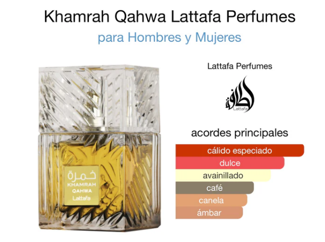 Khamrah Qahwa de Lattafa Perfumes es una fragancia de la familia olfativa para Hombres y Mujeres. Esta fragrancia es nueva. Khamrah Qahwa se lanzó en 2023. Las Notas de Salida son canela, cardamomo y jengibre; las Notas de Corazón son praliné, Frutas confitadas y flores blancas; las Notas de Fondo son café, vainilla, haba tonka, benjuí y almizcle.