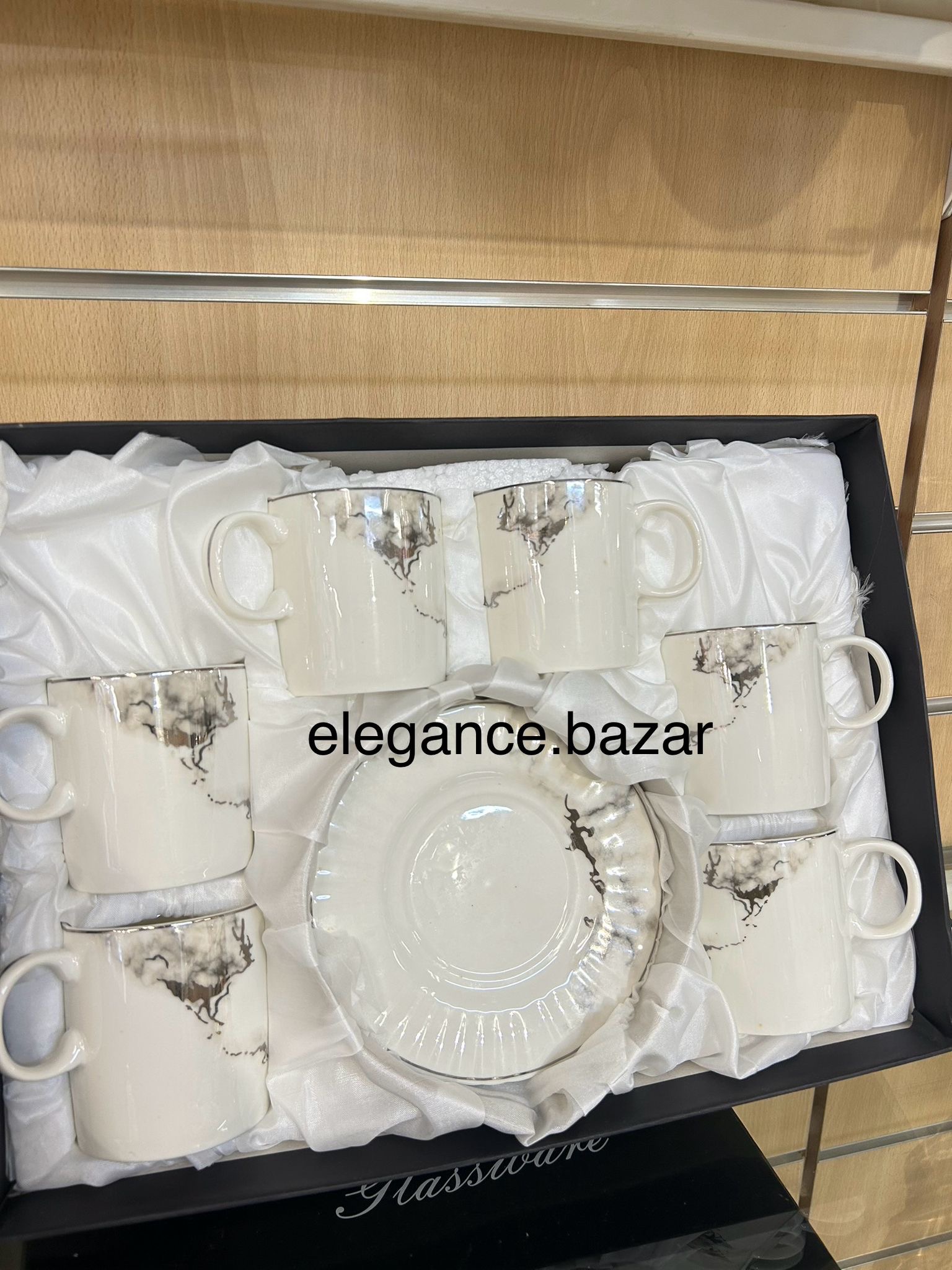 Este elegante set incluye seis tazas de cerámica acompañadas de sus respectivos platillos, presentados en una caja decorativa con interior satinado, ideal tanto para uso personal como para regalo.