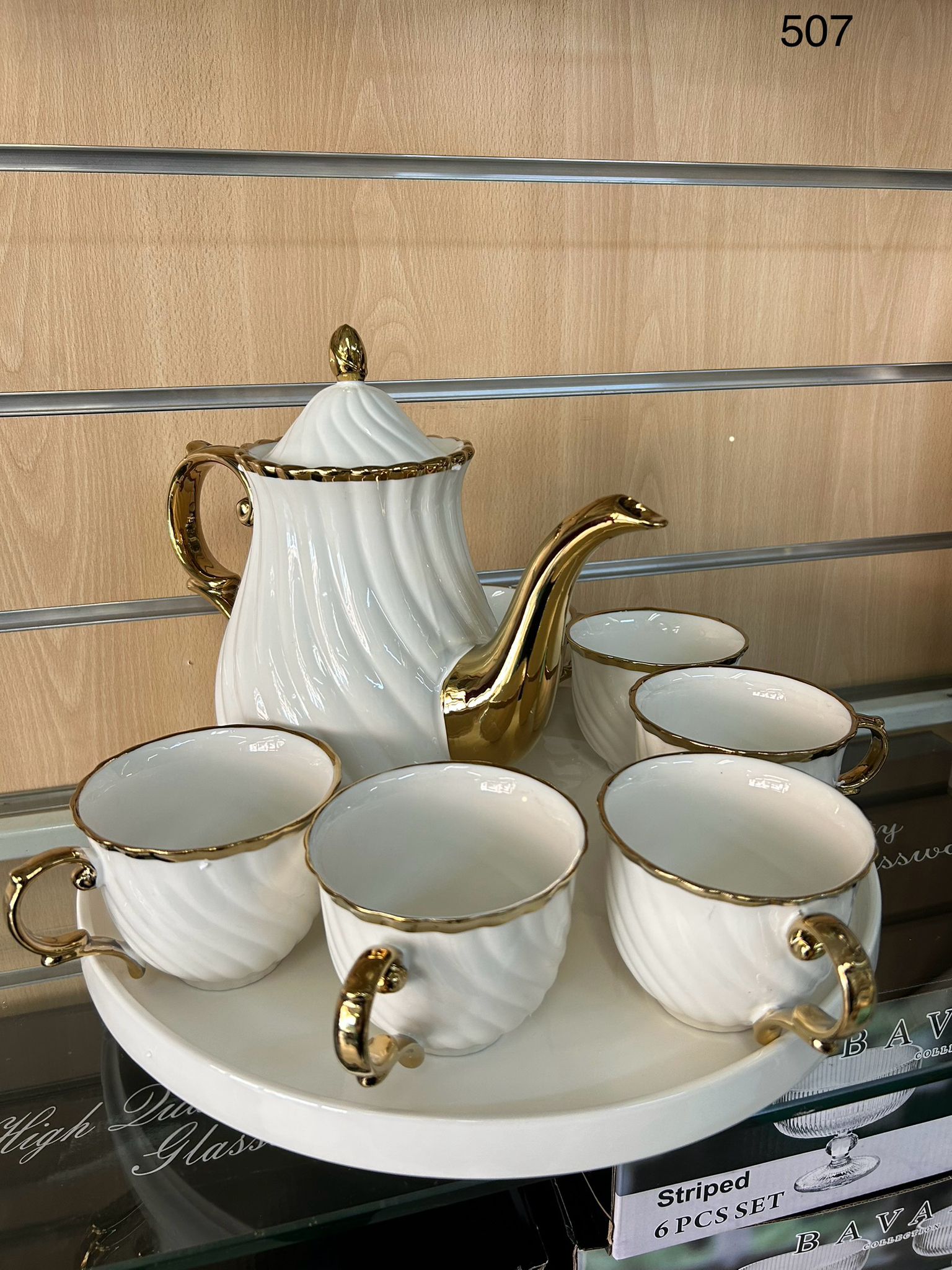 Este refinado set de café con leche de porcelana fina incluye 6 tazas, una bandeja a juego y una tetera de diseño armonioso. Cada pieza destaca por su acabado delicado, su resistencia y su estética atemporal.