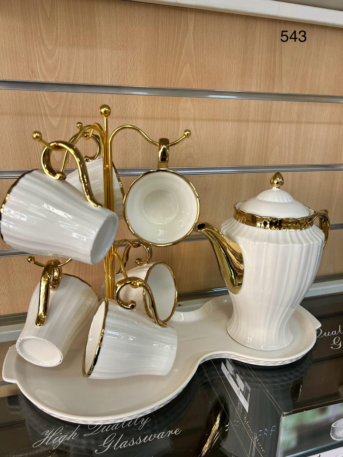 Este refinado set de café con leche de porcelana fina incluye 6 tazas, una bandeja a juego y una tetera de diseño armonioso. Cada pieza destaca por su acabado delicado, su resistencia y su estética atemporal.
