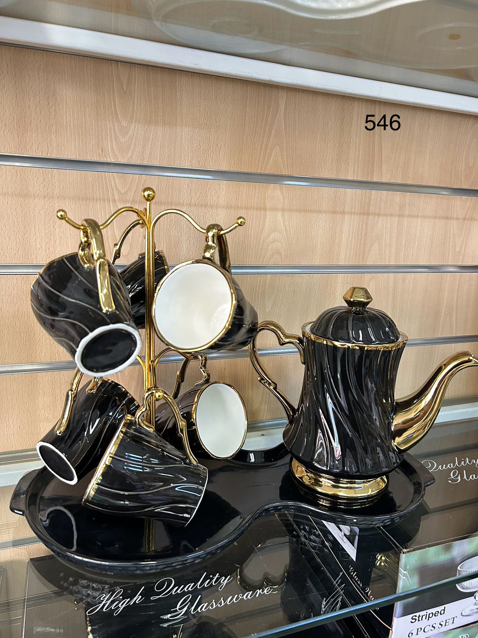 Este refinado set de café con leche de porcelana fina incluye 6 tazas, una bandeja a juego y una tetera de diseño armonioso. Cada pieza destaca por su acabado delicado, su resistencia y su estética atemporal.
