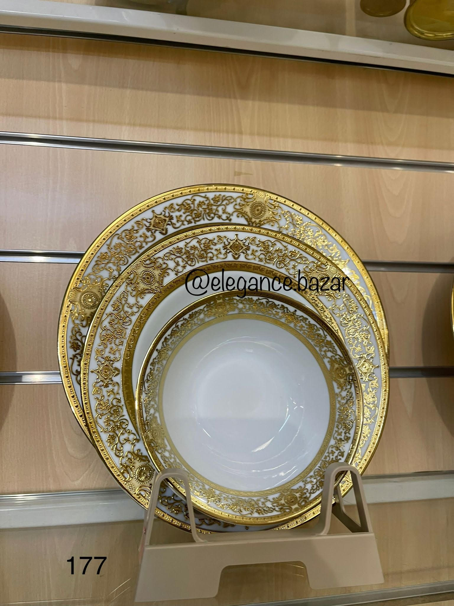 Cada pieza está elaborada en porcelana de alta calidad y decorada con un delicado borde en relieve con acabado dorado, que aporta un toque sofisticado y atemporal. Su diseño ornamental realza cualquier presentación, ideal tanto para uso diario elegante como para celebraciones.
