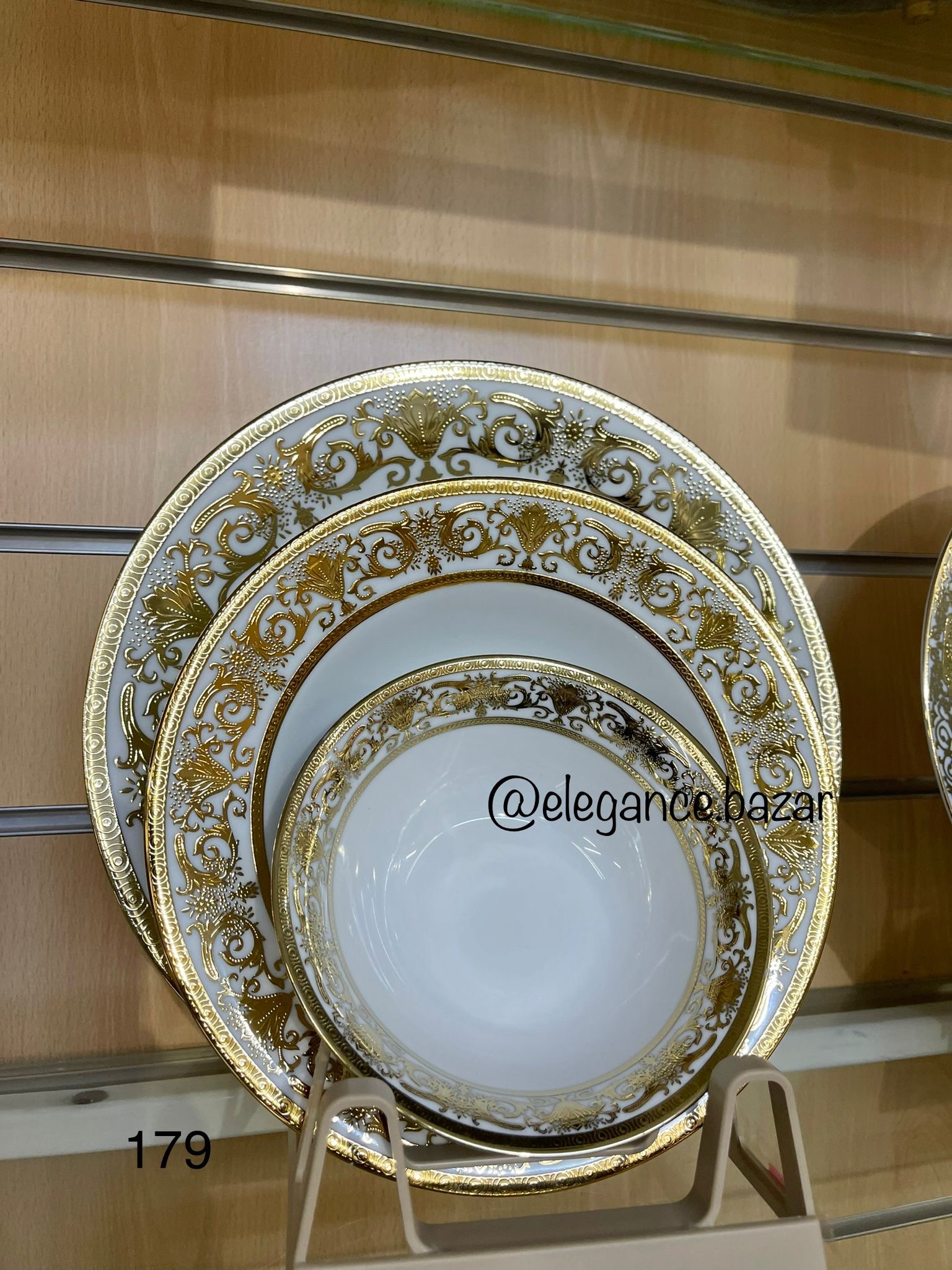 Elegante vajilla de porcelana de 18 piezas con diseño clásico en blanco y finos detalles dorados, perfecta para ocasiones especiales o para vestir tu mesa con estilo.