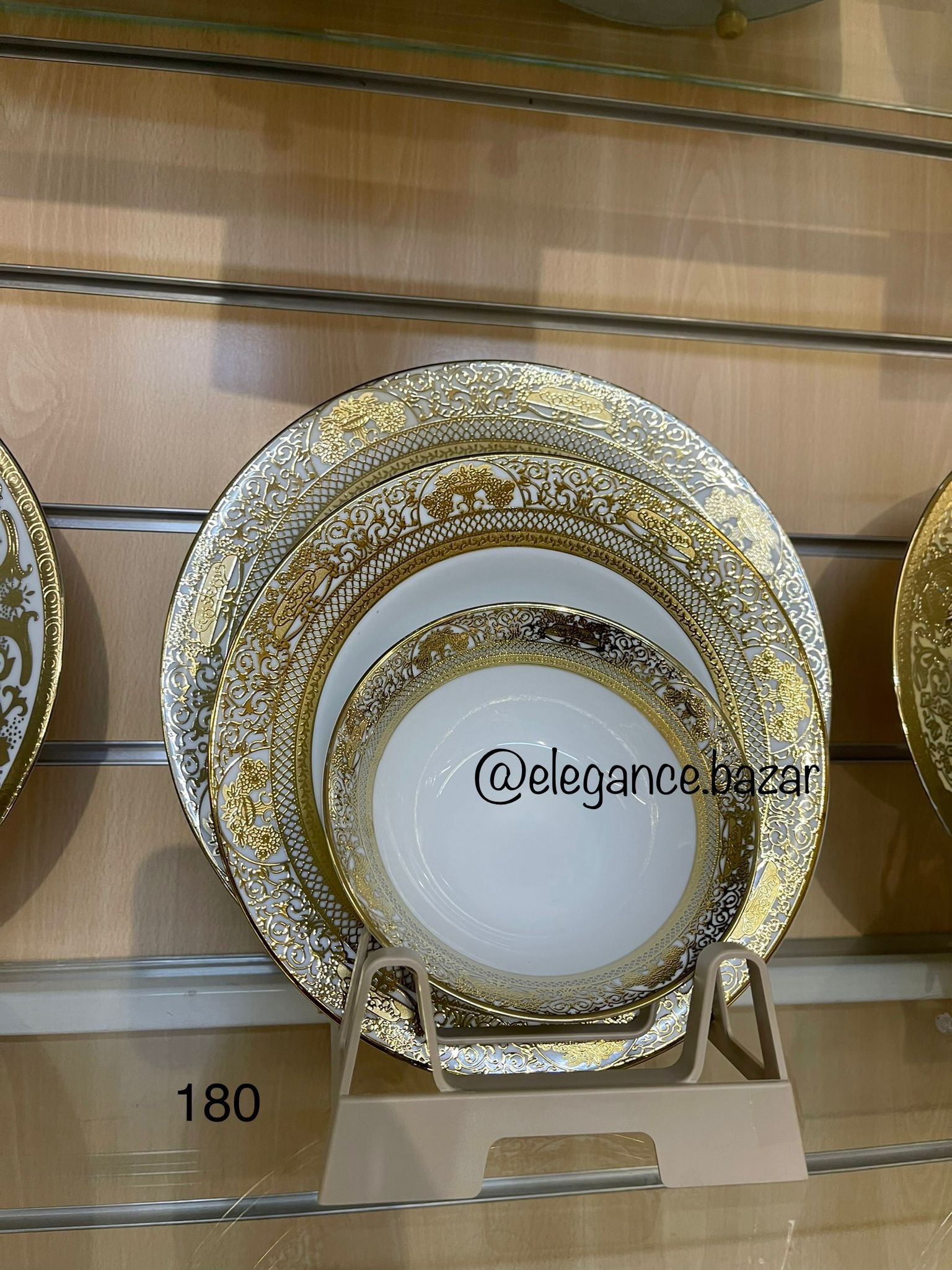 Elegante vajilla de porcelana de 18 piezas con diseño clásico en blanco y finos detalles dorados, perfecta para ocasiones especiales o para vestir tu mesa con estilo.