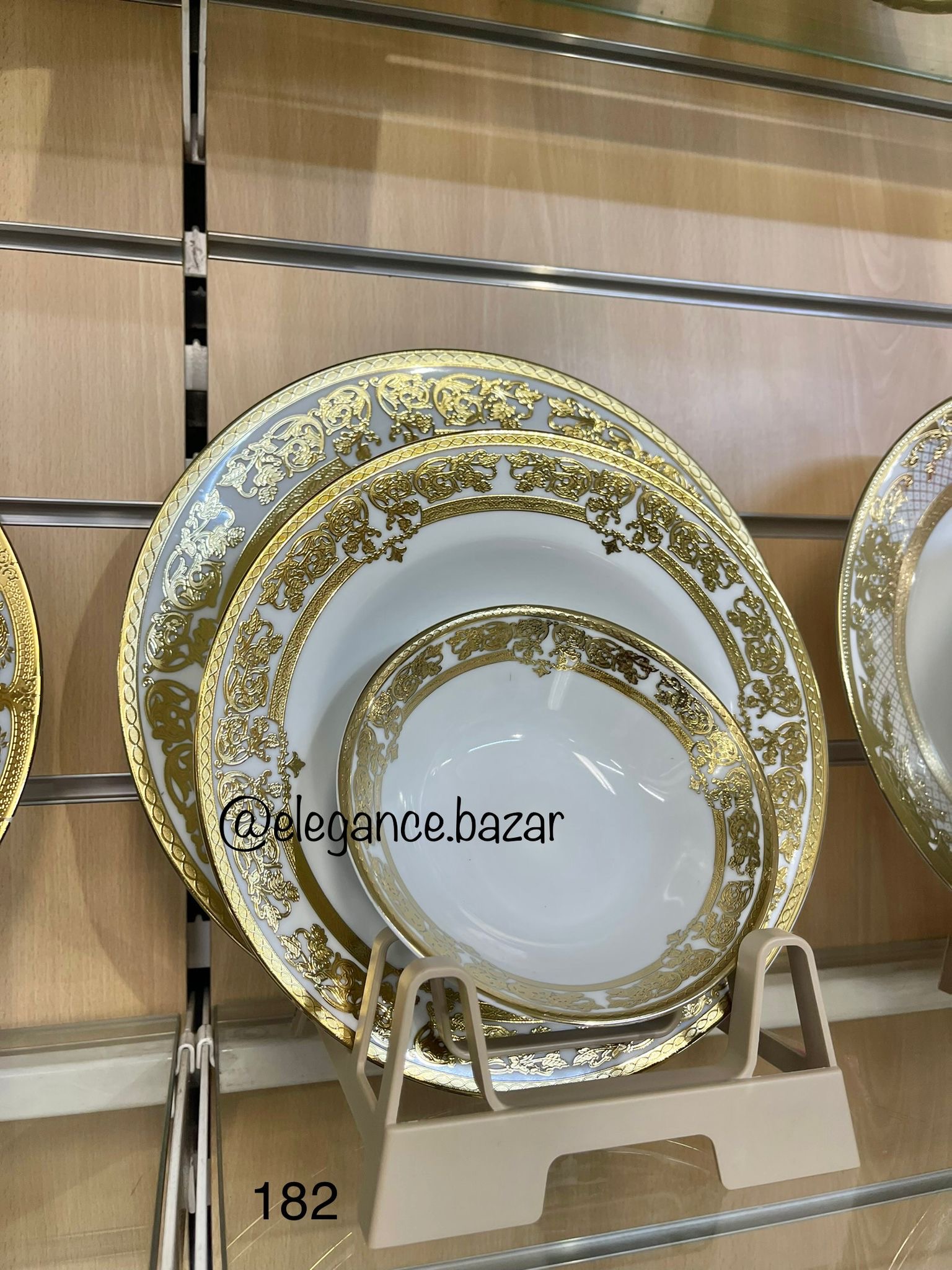 Elegante vajilla de porcelana de 18 piezas con diseño clásico en blanco y finos detalles dorados, perfecta para ocasiones especiales o para vestir tu mesa con estilo.