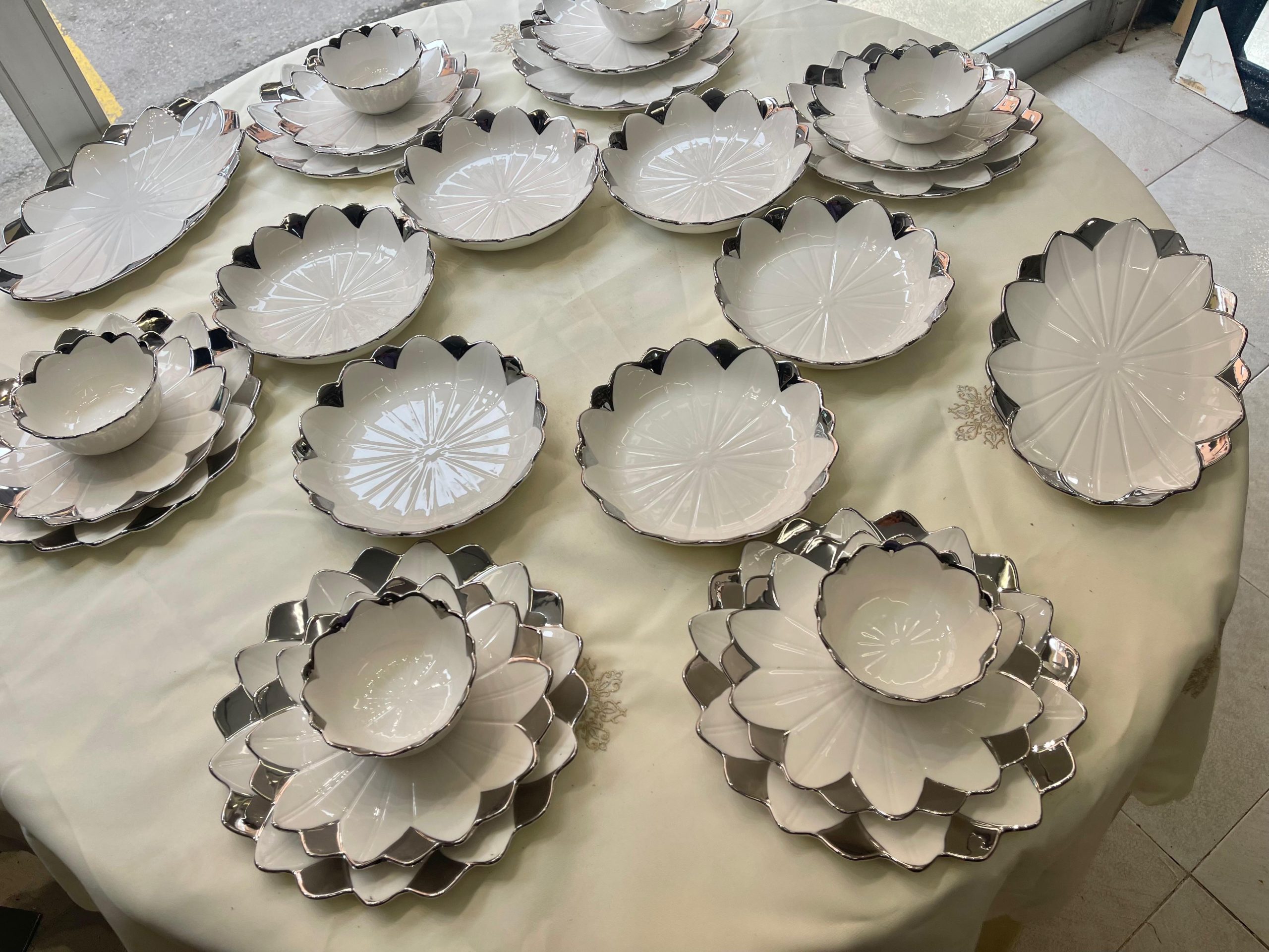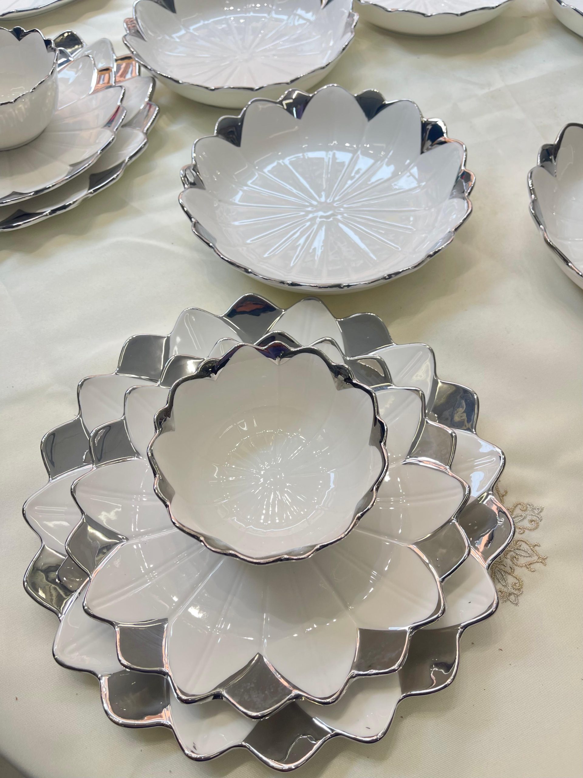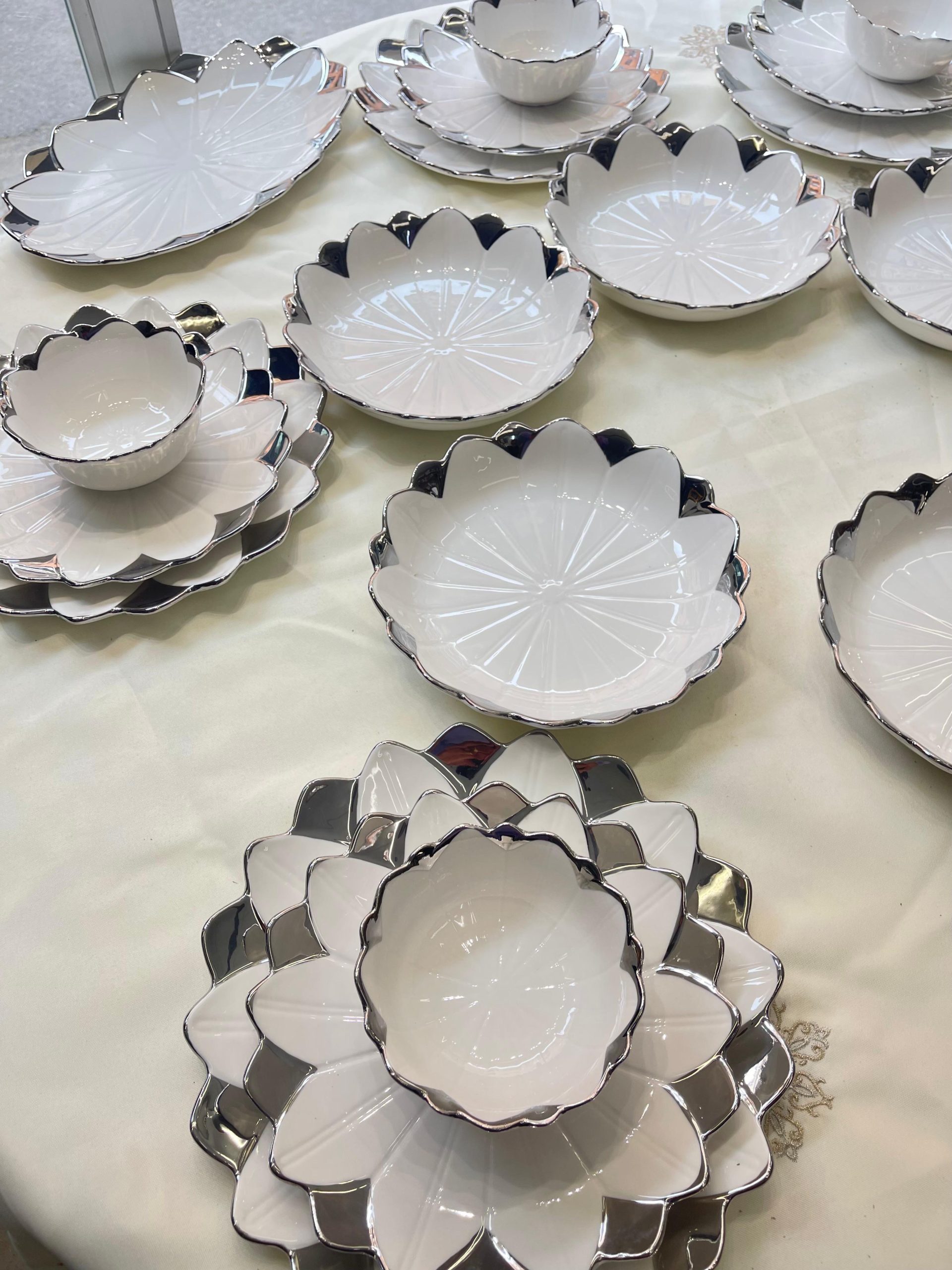 Cada pieza está elaborada en porcelana de alta calidad y decorada con un delicado borde en relieve con acabado dorado, que aporta un toque sofisticado y atemporal. Su diseño ornamental realza cualquier presentación, ideal tanto para uso diario elegante como para celebraciones.