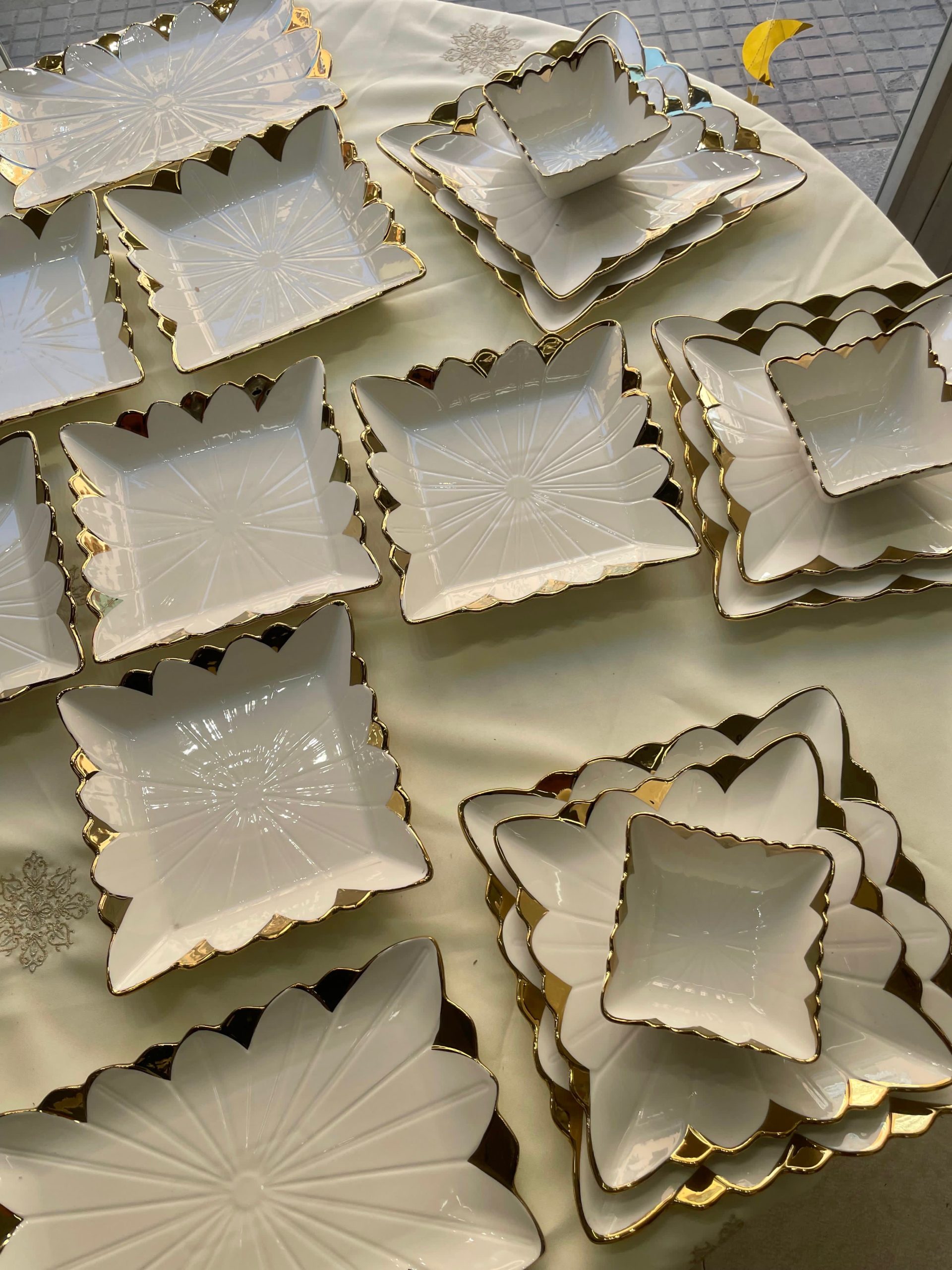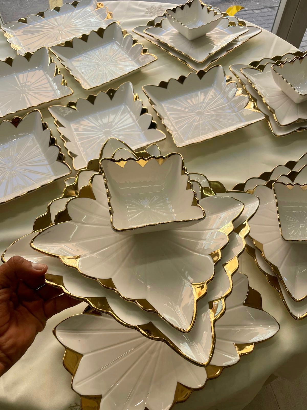 Cada pieza está elaborada en porcelana de alta calidad y decorada con un delicado borde en relieve con acabado dorado, que aporta un toque sofisticado y atemporal. Su diseño ornamental realza cualquier presentación, ideal tanto para uso diario elegante como para celebraciones.