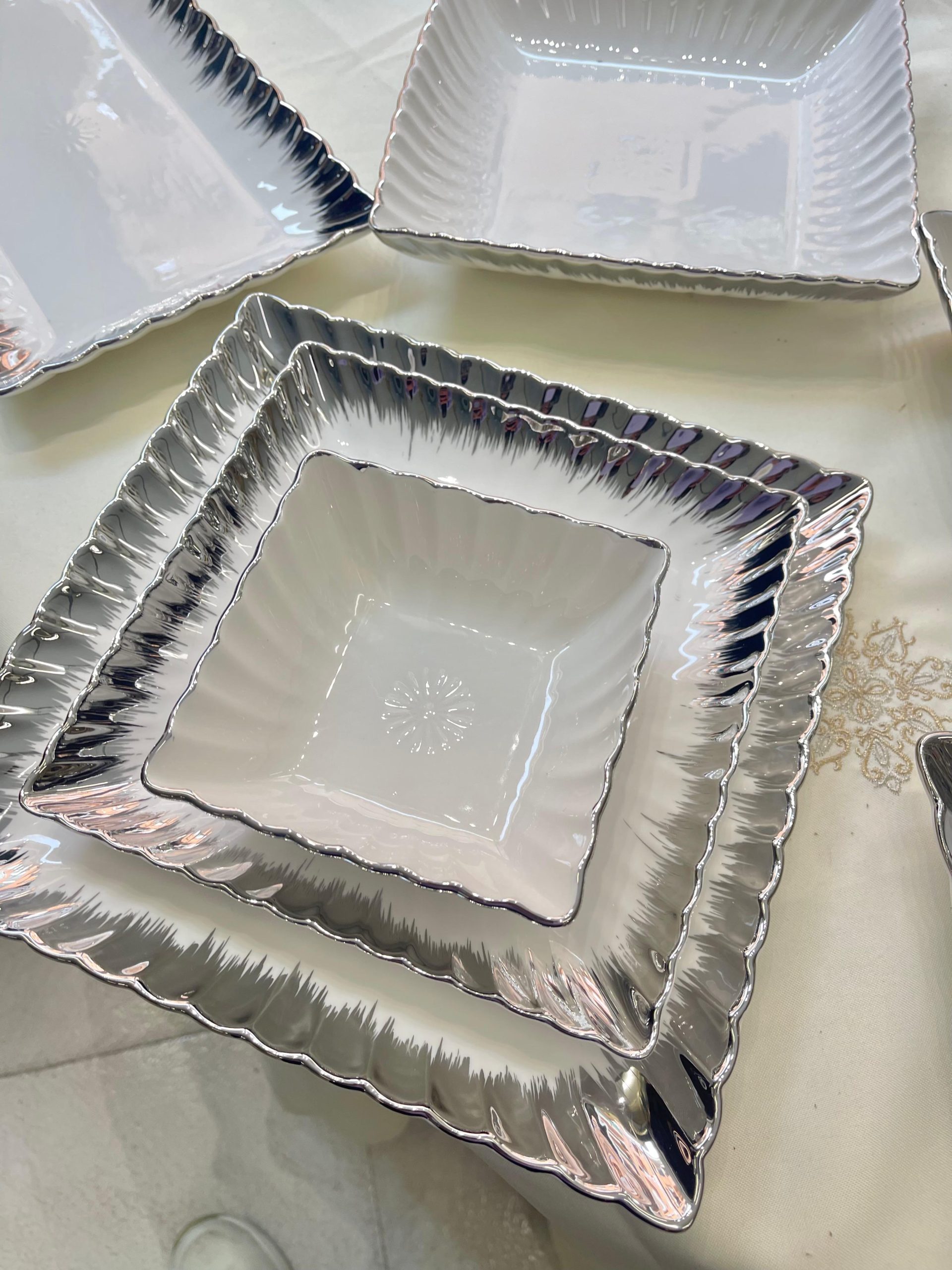 Cada pieza está elaborada en porcelana de alta calidad y decorada con un delicado borde en relieve con acabado dorado, que aporta un toque sofisticado y atemporal. Su diseño ornamental realza cualquier presentación, ideal tanto para uso diario elegante como para celebraciones.